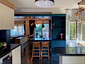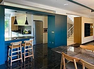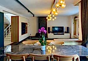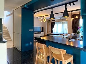 2021, Demirciköy, Sarıyer, İstanbul – Villanın zemin katı tamamen yeniden tasarlandı. Gereksiz duvarlar ve kapılar kaldırılarak, giriş, mutfak, yemek odası ve oturma odasının mekansal ve görsel olarak birbirine bağlandığı benzersiz bir açık alan oluşturuldu. Mobilyalardaki modern çizgiler ve kaliteli malzemeler, ailenin günlük yaşamı için zengin ve hayat dolu mekanlar yaratıyor.