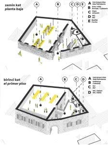 Projede yenilenen mekanların çok fonksiyonlu olması amaçlanmaktadır. Zemin kat bölgedeki küçük üreticilere destek olmak için yerel ürün pazarı, bölge halkının aktif rol alabileceği sergiler, zaman zaman konferanslar ve konserlere ev sahipliği yapabilecek nitelikte olacak, pazardaki ürünler kullanılarak, Akdeniz’in ve birçok farklı mutfağın yemeklerinin yapıldığı bir kafe ile zemin katın fonksiyonu tamamlanacaktır.